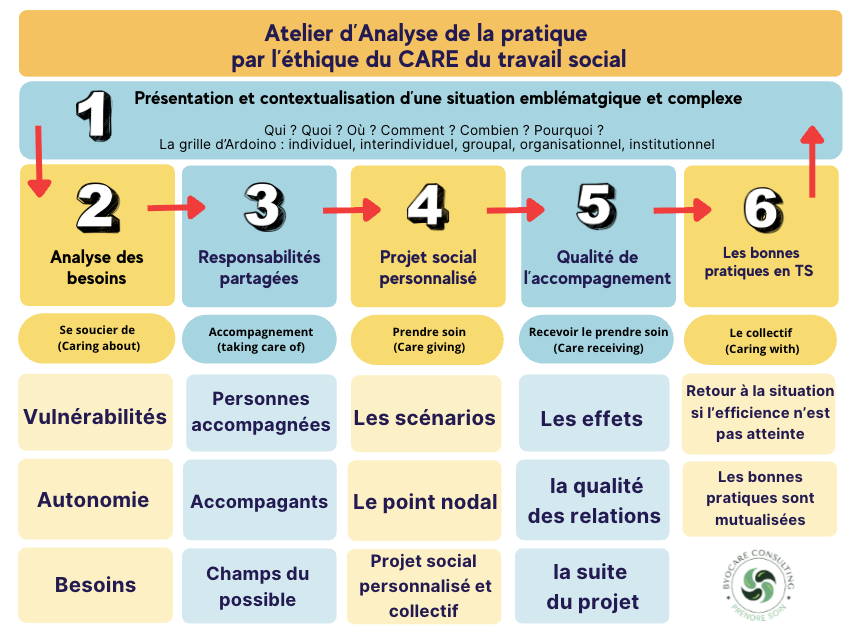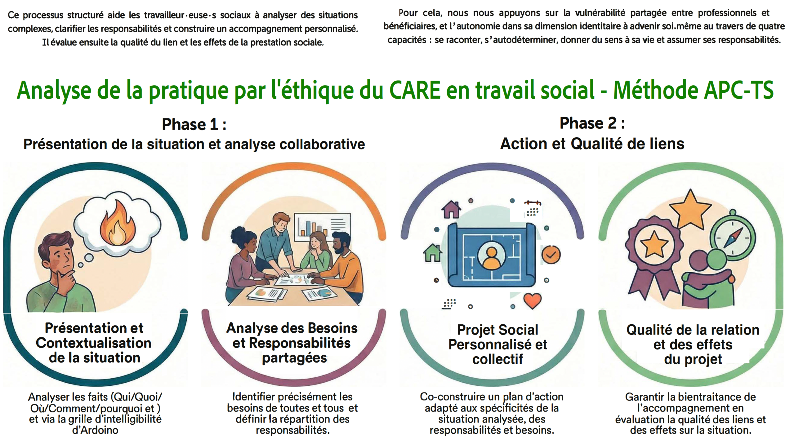Pour s’assurer de la dynamique agile et évolutive d’une telle clinique, La méthode de l’Analyse de la pratique par l’éthique du Care du travail social (Méthode APC) permettent de structurer et d’opérationnaliser les actes professionnels selon quatre étapes : l’analyse des besoins fondamentaux, la charte des responsabilités partagées, la co‑construction de projets personnalisés réalistes, et l’évaluation centrée sur l’autonomisation réelle des personnes non seulement du point de vue de l’indépendance mais surtout sur leurs capacités à advenir eux-mêmes.